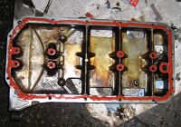 Um überhaupt an die Ölpumpe zu kommen muss der Zahnriemen und der Krümmer ab. Dann die Ölwanne, der Saugrüssel (neue Dichtung nicht vergessen) und dann das Motorunterteil. Falls es nicht abgeht, hängt es sicher noch an diesen Bolzen oben. An die kommt man nur mit 10er Nuss und 15cm Verlängerung durch jeweils einen dieser Gummistöpsel in der Kupplungsglocke. Bei der Bauerei empfielt es sich die Schrauben extrem geordnet abzulegen.