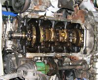 Im Bild rechts sieht man den Motor dann offen und ohne Ölpumpe (zum Federtausch muss die Pumpe eigentlich nicht raus, da man an den Sprengring, der die Feder hält, gut von unten drankommt. Sind aber nur ein paar Schrauben und dann ist die auch ab.