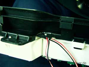 Man folgt dem Kabel (unten durch den freigewordenen Fußraum) und fühlt einen Stecker. Diesen trennen. Jetzt ist die LED frei.