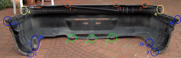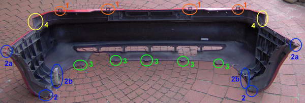 Bei der ECP-Schürze kann man sehen das rechts der "Verbindungsstab" (2b) noch am Auto verblieben ist, links ist er an der Schürze. Da der Stab etwas mit der Karosserie verklebt ist, sollte man ihn lieber am Auto lassen. Außerdem kann man sehen das an der ECP-Schürze der kleine Spritzschutz zwischen (2) und (2b) nicht mehr montiert ist, bei der T22-Schürze schon. Das passiert wenn man (2a) nicht löst. Es ist aber einfacher (2) zu lösen, denn dann braucht man die 2 Schrauben, mit denen der Spritzschutz an der Karosserie befestigt ist nicht zu lösen. Diese sind nämlich oft vergammelt.