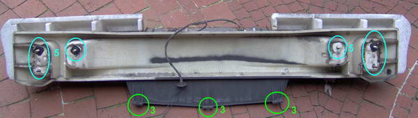 Weiter geht es mit den Schrauben (4), welche von innen in Höhe der Blinker verschraubt sind. Sehen kann man sie nicht aber erfühlen. Am besten einen Maulschlüssel (ich glaube 10er) oder eine lange Nuss verwenden. Sind aber nicht besonders fest und lassen sich nach dem lösen locker mit der Hand abschrauben.
