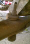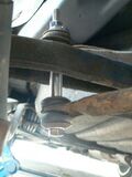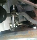 2. Die Gewindestange von unten durch den Querlenker schieben und von oben dann das zweite Stabigummi und eine weitere große Scheibe aufstecken. Bei Bedarf (z.B. wenn man erst eine Seite der Stabistangen macht) kann man einen Wagenheber benutzen um der Vorspannung des Stabis entgegenzuwirken.