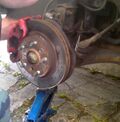 Erstmal Reifen runter, dann die oberen beiden Muttern an der Gewindestange lösen, die sind gekontert! Obere Mutter abmachen, dann die untere Muter abdrehen, evtl. muß die Gewindestange unten per Nuß gehalten werden. Dann hoffen dass die Gewindestange nicht mit der Hülse verknustert ist (mir ist die erste entgegen gefallen, die nächsten 3 mussten abgeflext werden). Also entweder die Gewindestange aus der Distanzhülse ziehen oder jeweils am unteren Ende der Distanzhülse abflexen. Danach die Brocken rausziehen.